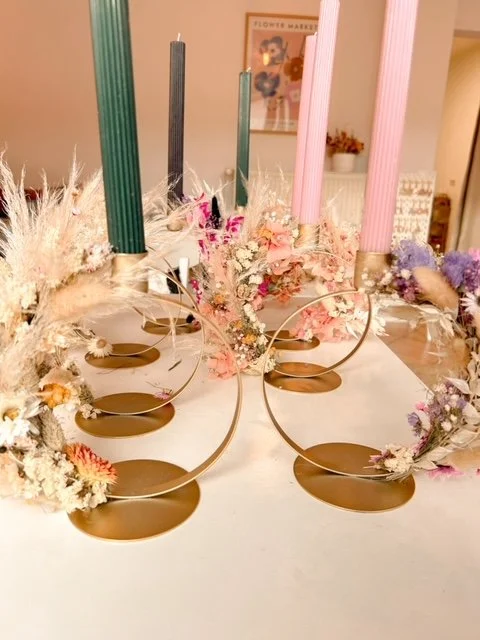 Wir verzaubern einen Metallring mit wunderschönen Trockenblumen (auf Wunsch auch Holz - vorab ankündigen ) 25 cm Durchmesser. Wir gestalten ihn "halbgebunden".