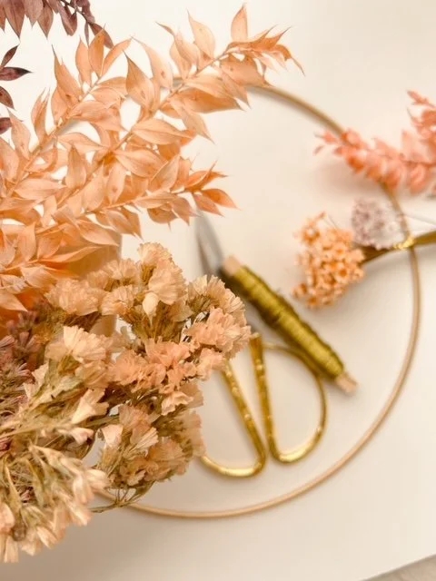 Gemeinsam gestalten wir einen hübschen Flower Hoop, dazu binden wir eine Hälfte eines Metall, oder Holzrings, mit einem Blumenarrangement.
